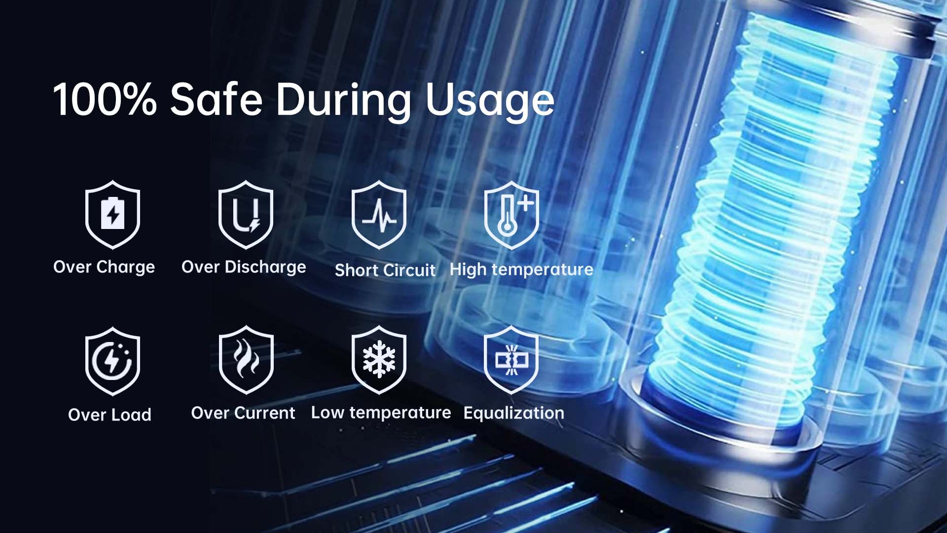 - Comprehensive Protection: This advanced system provides eight layers of protection, including safeguards against overcharging, over-discharging, overcurrent, overload, low temperatures, high temperatures, short circuits and ensures cell balancing.