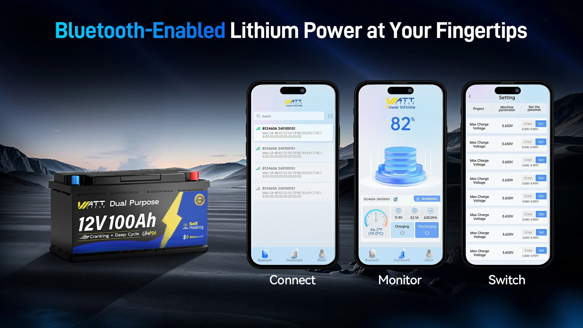 - Bluetooth Connectivity: Integrated Bluetooth allows you to easily monitor battery health, charge status, and usage via a WattCycle app, ensuring you stay in control at all times.
