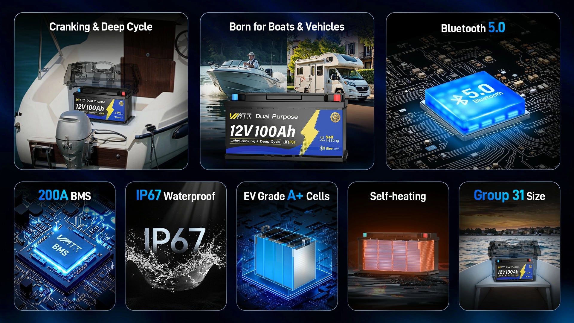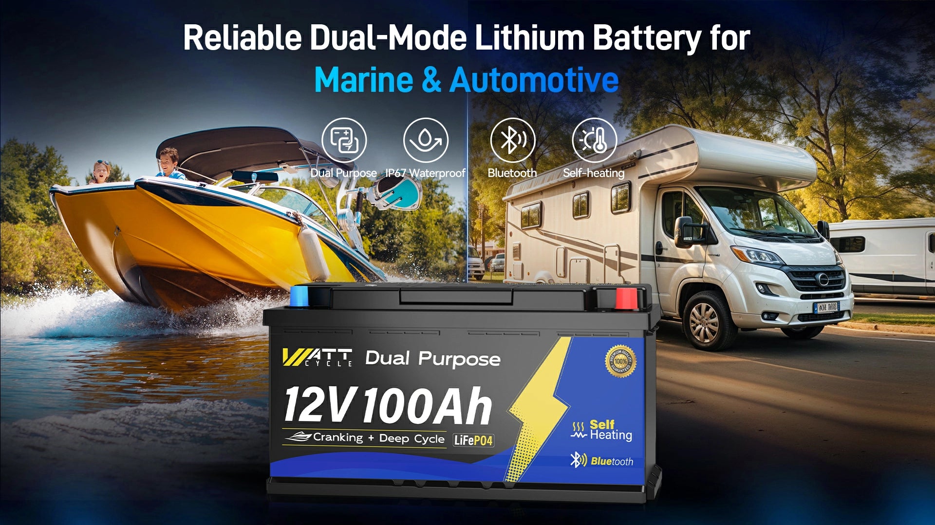 WattCycle 12V 100Ah marine starting battery integrates a host of practical features—from Bluetooth 5.0 connectivity and a robust 200A Battery Management System (BMS) to an IP67 waterproof rating, EV Grade A+ cells, self-heating capability, and a forced start button. This comprehensive package makes it a top contender among dual purpose lithium marine batteries, delivering performance and reliability wherever your adventures take you.