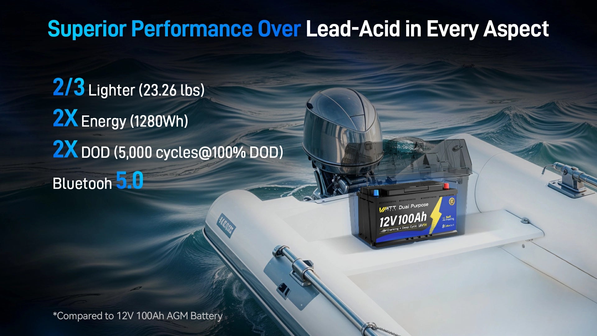 - High Capacity & Long Lifespan: Powered by advanced LiFePO4 technology, this 12V 100Ah battery ensures superior performance with a 10-year lifespan and over 6,000 deep cycles @80% DOD, making it perfect for both marine and automotive applications.