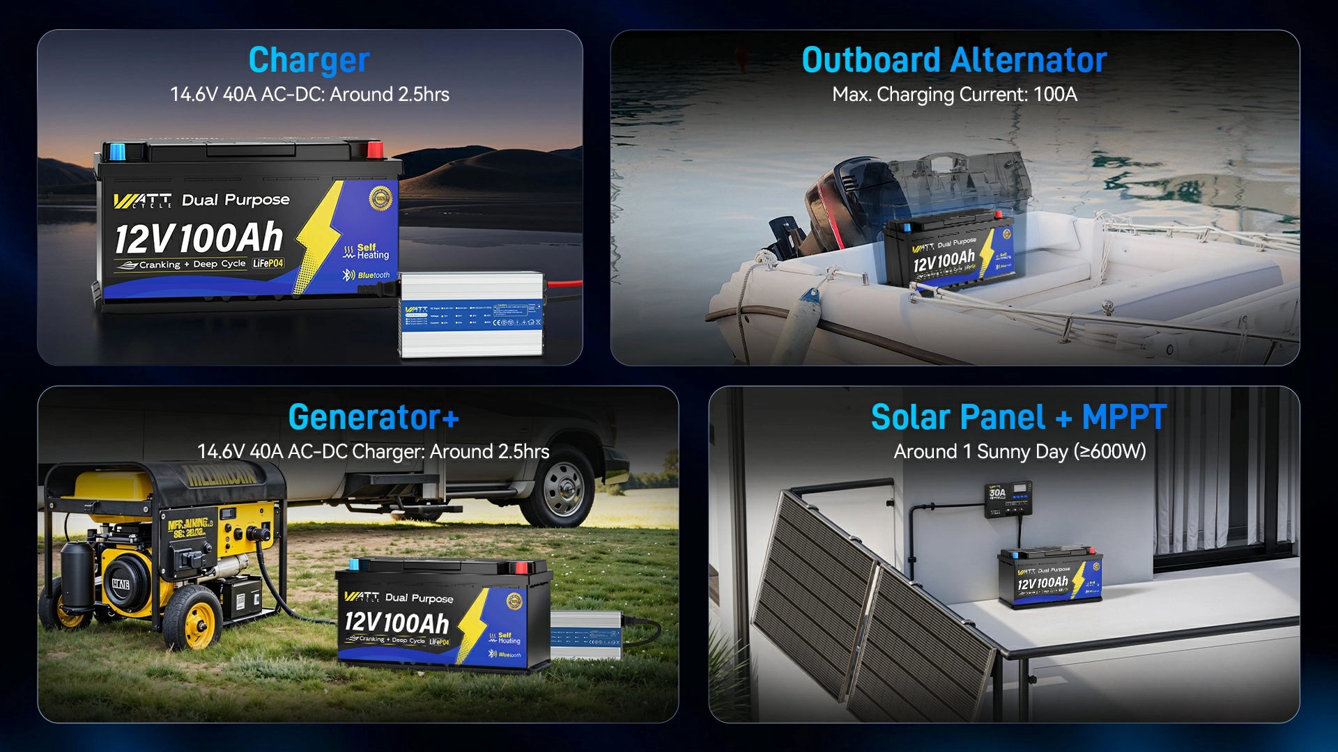 ⚡Fast & Flexible Charging Ways: 1C charging rate, support LFP charger, solar panel, generator and alternator charging.