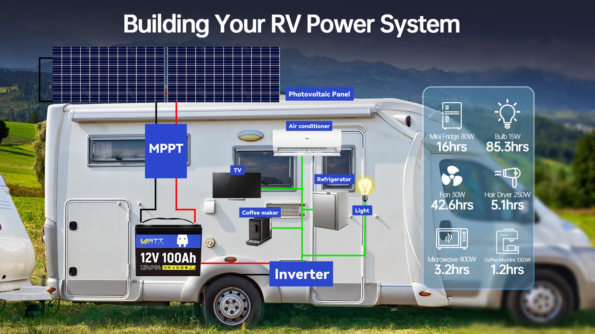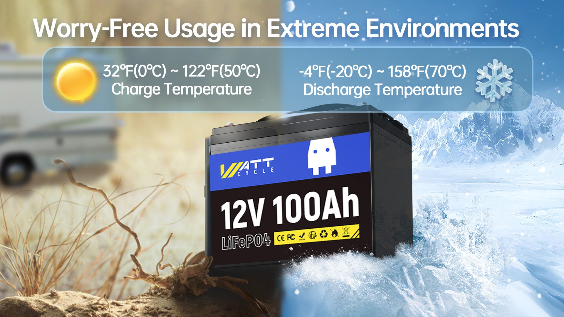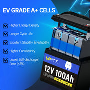 WattCycle 12V 100Ah deep cycle LiFePO4 battery with compact design (L260 x W168 x H209 mm) and IP65 water-and dustproof is equipped with Top EV grade A+ LiFePO4 cells and 100A safe BMS protection, providing excellent performance, unbeatable safety, and massive 1280W output power and 1280Wh energy for your indoor- and outdoor applications.
