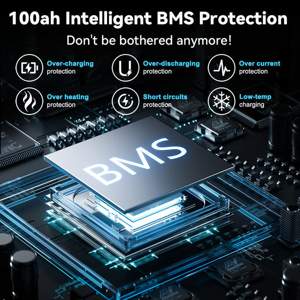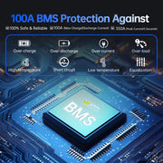 - Built-in BMS Protection: Featuring an integrated 100A BMS protection system, the lithium battery automatically disconnects if the discharge current exceeds 300±50A, ensuring optimal safety.