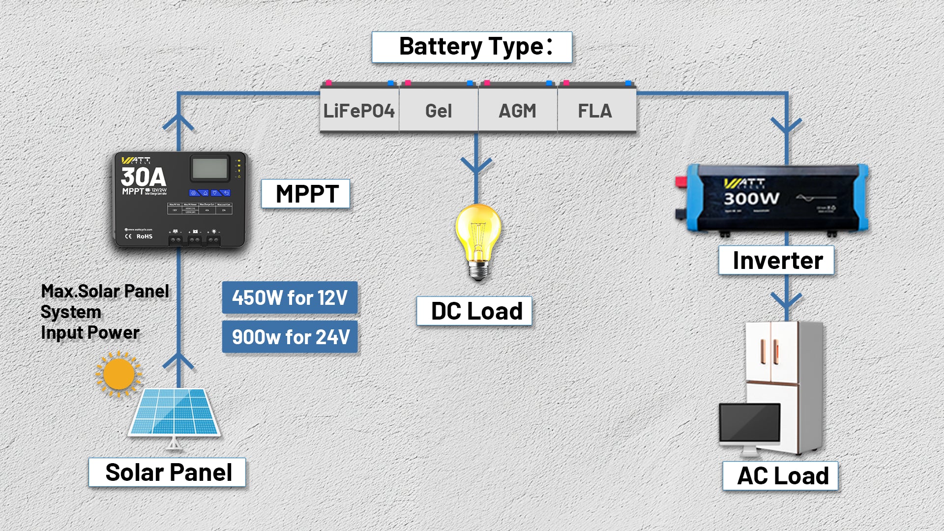 | Input | 450W/12V, 900W/24V Maximum input voltage: {<}100Voc Maximum charging current: 30A |