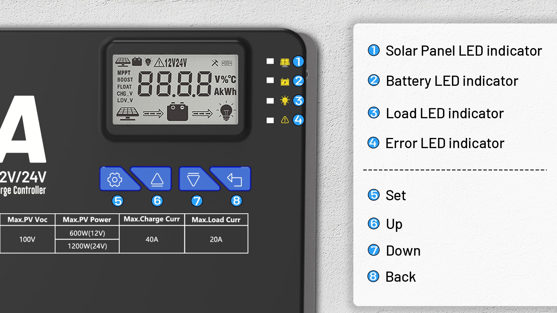 Visual indicators for solar, load, battery, and fault statuses, providing clear, real-time feedback
