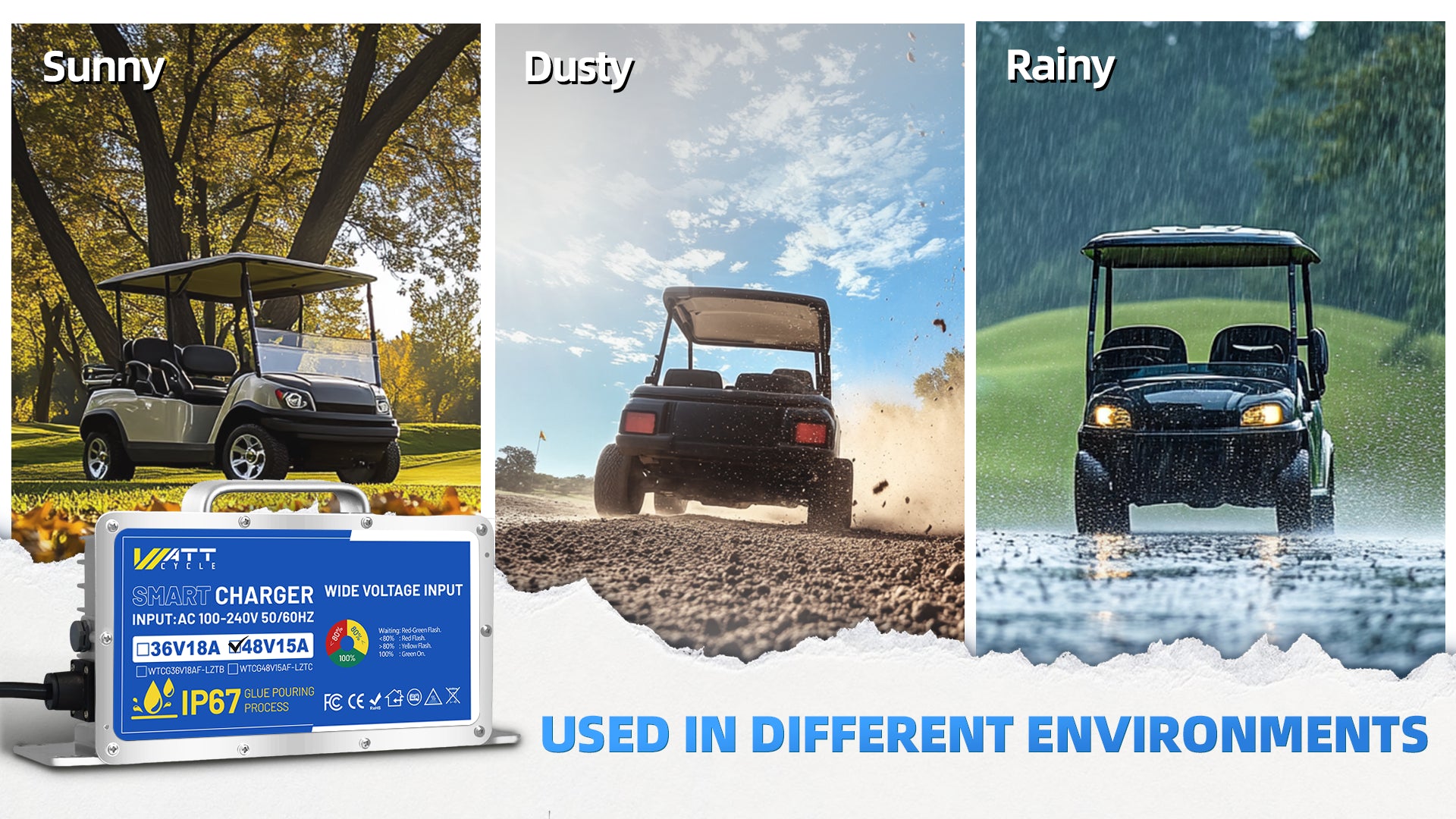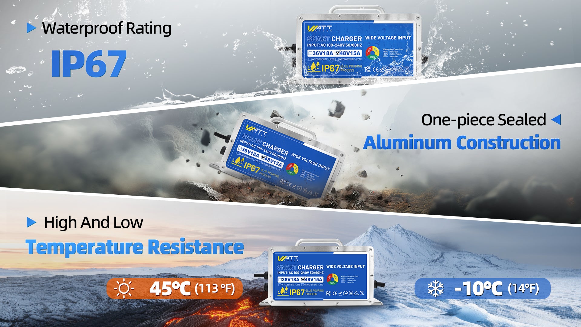 Constructed with one-piece sealed aluminum, this charger is waterproof (IP67) and resistant to high and low temperatures (-10°C to 45°C). Perfect for demanding environments.