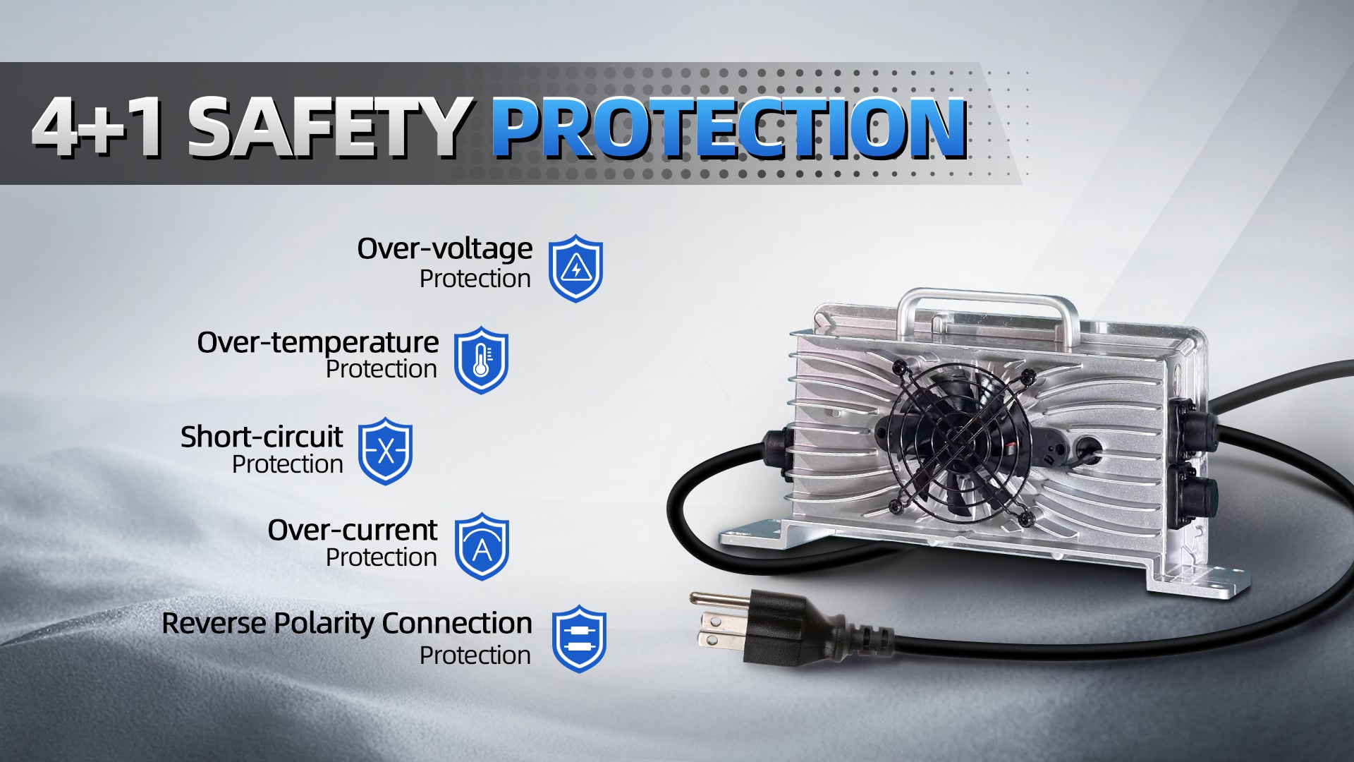 Equipped with 4+1 safety protections, including over-voltage, over-temperature, short-circuit, over-current, and reverse polarity protection, this charger ensures safe and reliable operation.